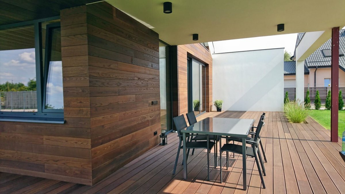 Гибкая доска производится из природных экологичных материалов (кварцевый песок, глина, полимерные связующие), имитирует фактуру и цвет натуральной деревянной брашированной доски, устойчива к намоканию и выгоранию на солнце.